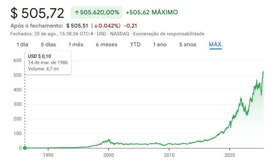 Mesmo diante de momentos mais conturbados e crises globais, as ações da Microsoft mostraram resiliência. Observe no gráfico a evolução dos papéis da empresa na Nasdaq desde 1986: